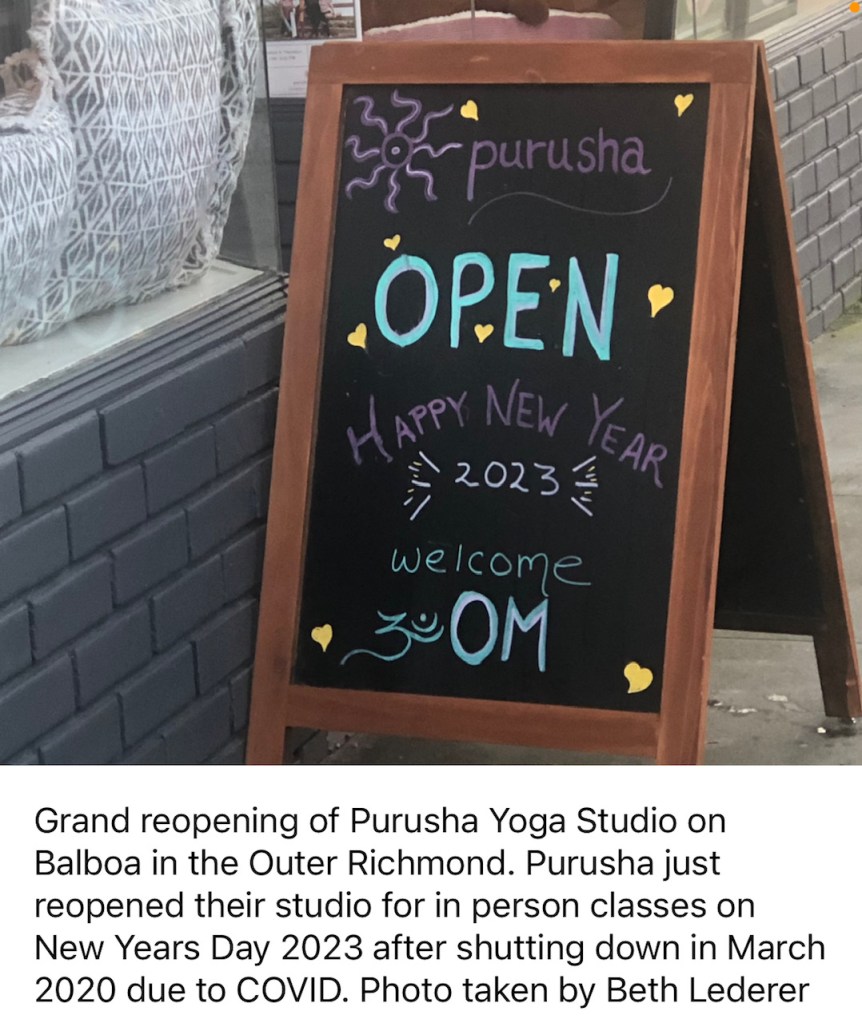 A chalkboard easel stands outside of Purusha Yoga Studio in the Richmond District welcoming Yoga students back. The beautiful penmanship demands attention: “Purusha OPEN, Happy New Year 2023, Welcome OM.”