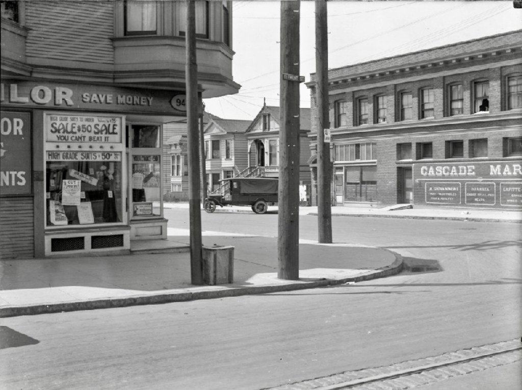 Above: Take a trip back in time to 103 years ago and this is what the southwest view at the corner of Clement Street and 11th Avenue looked like on May 11, 1920. Masten the Tailor was on the southeast corner, Cascade Market was on the southwest corner. Photo courtesy of a private collector/Western Neighborhoods Project/OpenSFHistory. Below: Both buildings still stand, with the one on the left moved to the rear of the lot. The tailor business is now Shabu Club and the storefront where the market was is now the Richmond Clay House ceramics studio. Photo by Michael Durand.