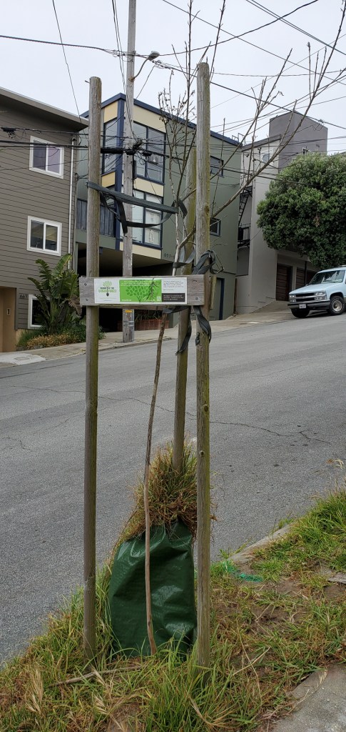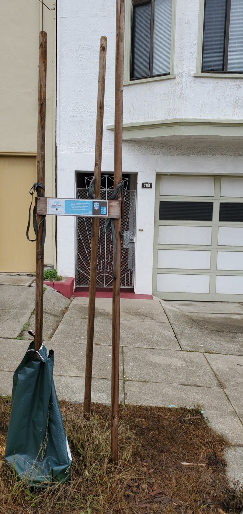 The trees that are sponsored through FUF are supposed to be taken care of by the sponsors. In some cases FUF will water them for the first 6 mos. DPW is supposed to water all the other saplings and the watering truck used to come to my block of La Playa St. but that stopped over two years ago. Since then I’ve been carrying buckets of water across the street for the one surviving sapling of the six that were planted in that half block.