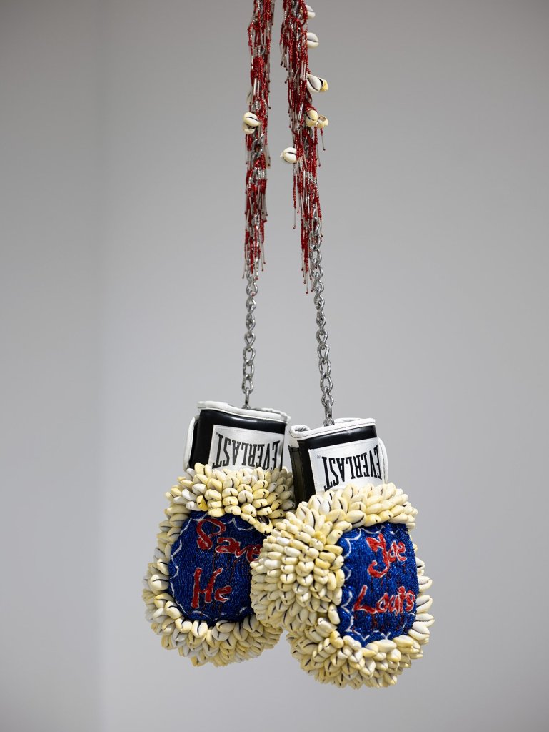 The striking, maximalist sculpture consists of a pair of Everlast boxing gloves dangling by metal chains, covered in strands of red and silver beads and cowrie shells. A dense cluster of shells frame the gloves. Blue beads fill in the majority of the glove surface with the words, “Save me,” hand-embroidered in red on one glove and, “Joe Louis,” on the other.