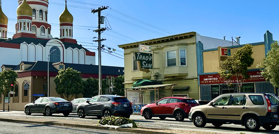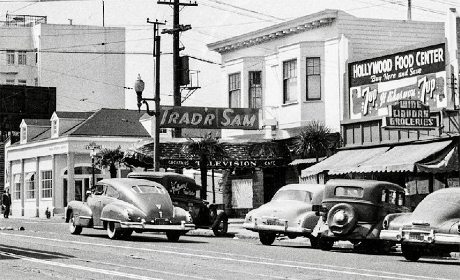 Below: This photo of Trad’r Sam, the Outer Richmond District Polynesian-themed bar on Geary Boulevard at 26th Avenue, was taken circa 1950. The bar was opened in 1937 by Sam Baylon. SF Heritage called it the “longest continuously running tiki bar in the world.” “Television” listed on the awning was a fairly new technology and apparently a draw for customers. Television was still in black-and-white back then. Photo courtesy of a private collector/Western Neighborhoods Project/OpenSFHistory.