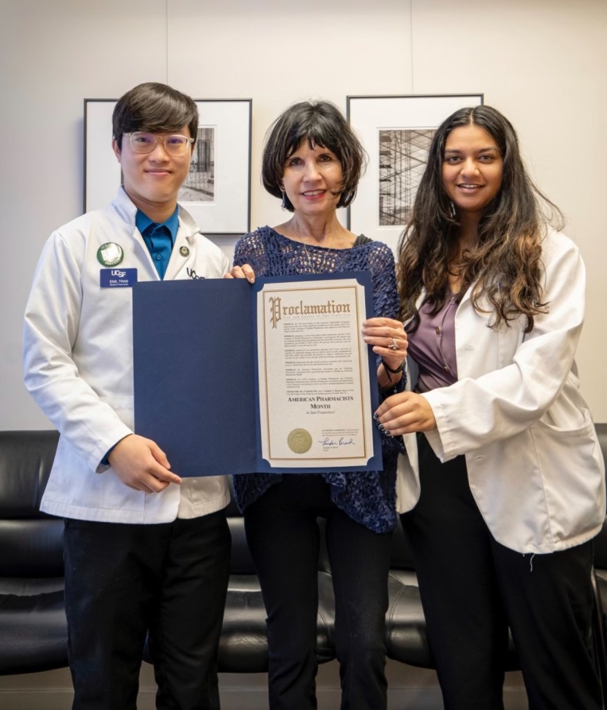 Patel and Tran presented Dean Giacomini with a proclamation issued by San Francisco Mayor London Breed, which declared October “American Pharmacists’ Month.” The mayor’s proclamation highlights the accessibility of pharmacists to the community and their crucial expertise on medication use and medication therapy management. The event exemplifies one of the many resources that pharmacists can provide to keep the community healthy and safe.