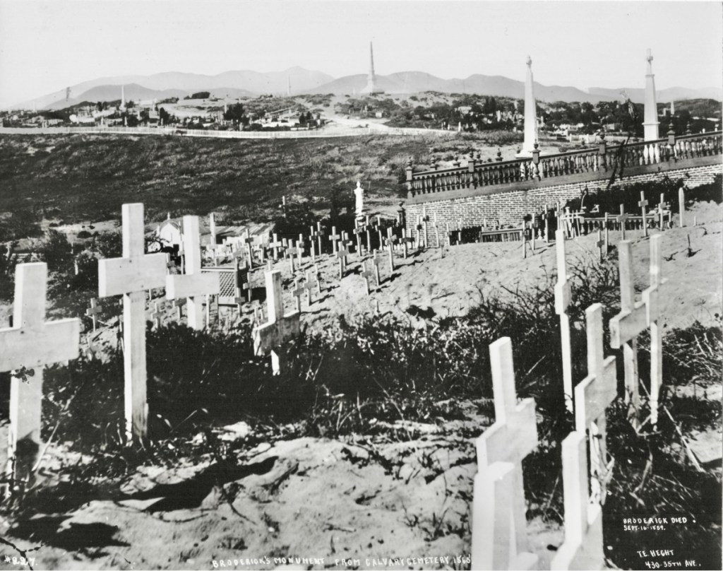 In 1853, the existing Mission Dolores and municipal Yerba Buena cemeteries were becoming too small to keep up with the booming population – and associated deaths – of gold rush San Francisco. City officials set their sights on a swath of land on the outskirts of town, far away from the dirt and disease of downtown, somewhere development was sure never to touch, in an area that we now call Laurel Heights, Anza Vista and the Inner Richmond. Furthermore, there was a growing trend of “rural” or “garden” cemeteries: lush, verdant land where visitors could picnic and spend a day. Lone Mountain Cemetery, as it was dedicated in 1854, was eventually partitioned into four main cemeteries: Calvary, Odd Fellows (including the still-existing Columbarium), Masonic and Laurel Hill. An estimated 136,000 dead were buried here.