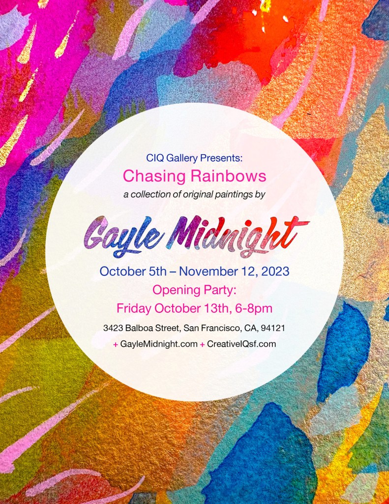 Internationally acclaimed award-winning artist Gayle Midnight will be showcasing a collection of 20 original abstract paintings from her Chasing Rainbows series at CIQ Gallery in San Francisco’s Outer Richmond District.