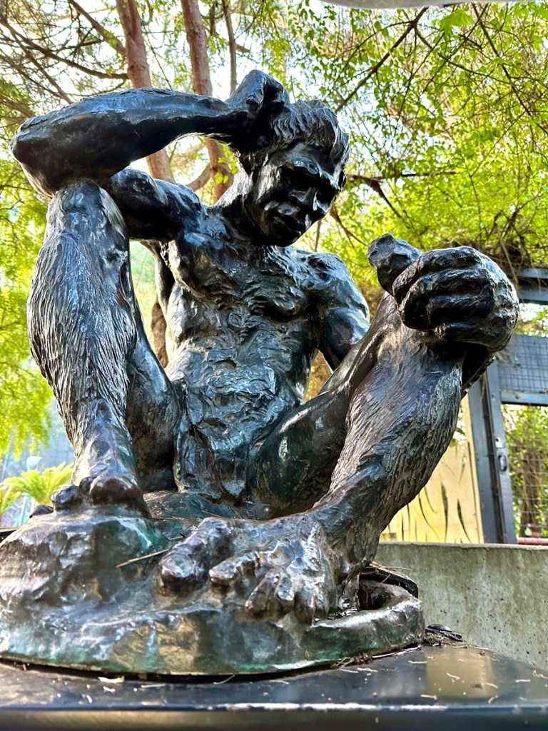 Today, Cave Man is in the tree-covered northeast corner of the George and Judy Marcus Garden of Enchantment to the east of the de Young Museum. The Garden’s western edge is a path running from the Music Concourse north to JFK Promenade and 10th Avenue, passing the de Young’s side entry near the base of the Hamon Observatory Tower.