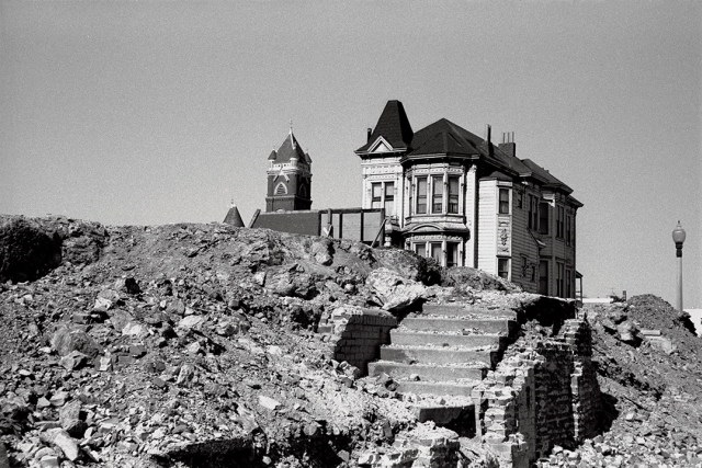 Demolition as part of redevelopment in the Western Addition. Historic photo of the Western Addition during redevelopment courtesy of the San Francisco Public Library.