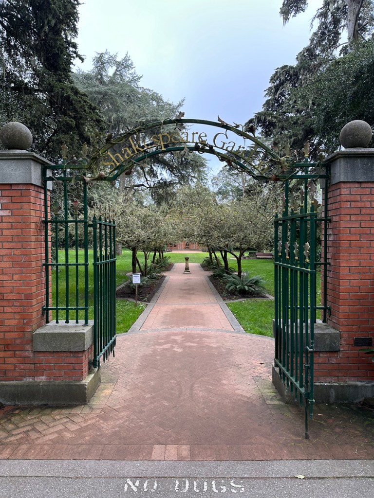The Garden has flowers mentioned in Shakespeare’s plays and six bronze plaques of Shakespearean plays’ quotes about flowers, according to the Oct. 8, 1967 San Francisco Chronicle. In 2008, two of the six bronze quote plaques were stolen, according to Phil Matier and Andy Ross’s May 7, 2008 column in the San Francisco Chronicle. Only two of the six installed bronze plaques have displayed flush edges, as of 2024.