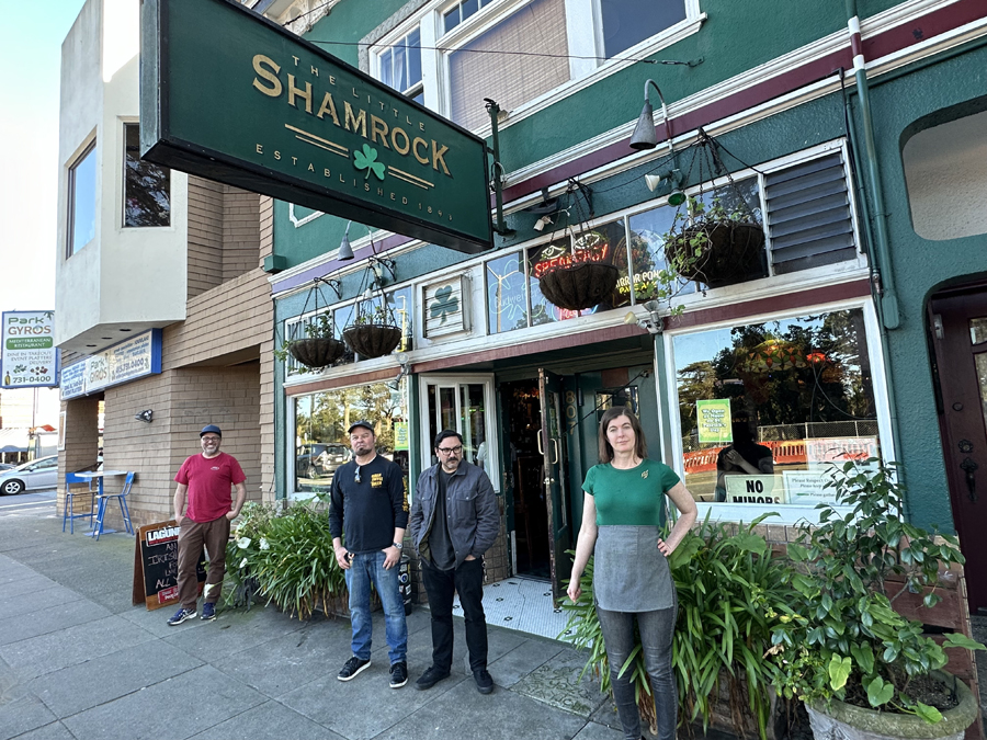 Below: Bartender Bobby (right) recruited and directed three of her regular customers – Charlie, Wade and Jacob – to help reenact the photo from 119 years ago. She was even looking for a dog to join the picture. Photo by Michael Durand.
