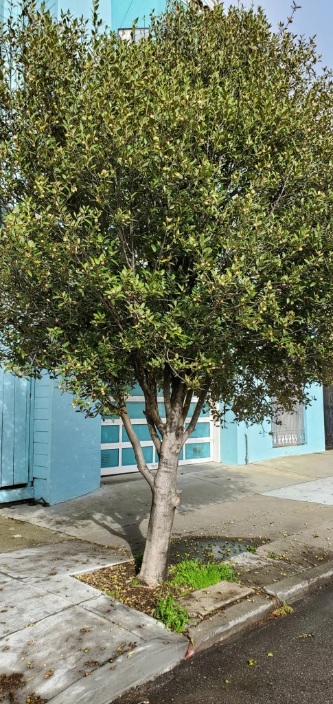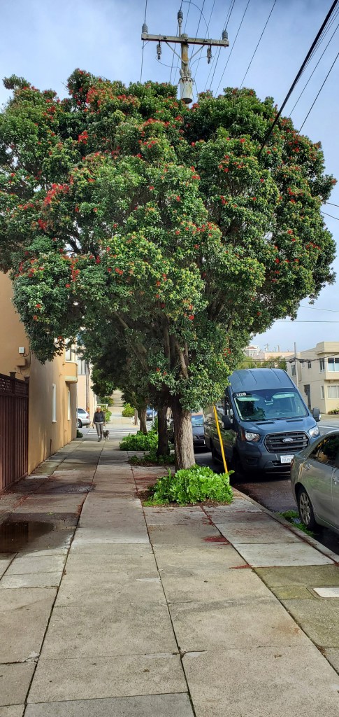 Thus far, none of the street trees in our survey are native to California, except Arbutus. Looking at the trees of nearby Golden Gate Park, certainly the many eucalyptus, also called gum trees, in the park are famously Australian, but the park also has spruce, pine, cypress and juniper so there may be a preponderance of native trees there.