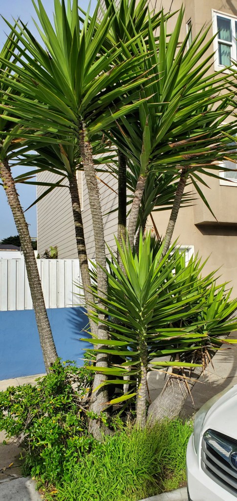 Cabrillo is lined with Spanish Daggers and Balboa Street is lined with dragon trees. Spanish Dagger is native to the southeastern United States. The dragon tree is native to the Canary Islands, Madeira, Cape Verde and western Morocco. I don’t see any Spanish Daggers on Balboa or any dragon trees on Cabrillo so this must be by design. Dragon trees are so short you hardly notice them, and they are not, properly speaking, trees.