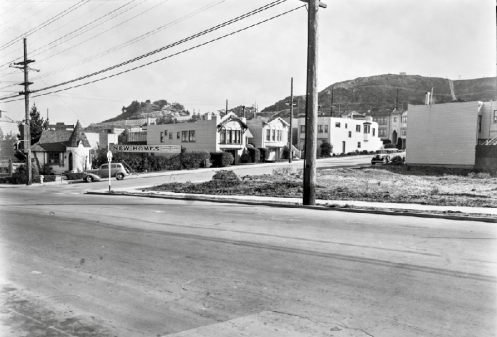 Above: View northeast from 19th Avenue to Pacheco Street on Feb. 6, 1937, showing the Arthur T. Winther real estate sales office and billboard on the northeast corner. Two homes at 1432 and 1426 Pacheco St., both built 1927, are at center. Photo courtesy of a private collector/Western Neighborhoods Project/OpenSFHistory.