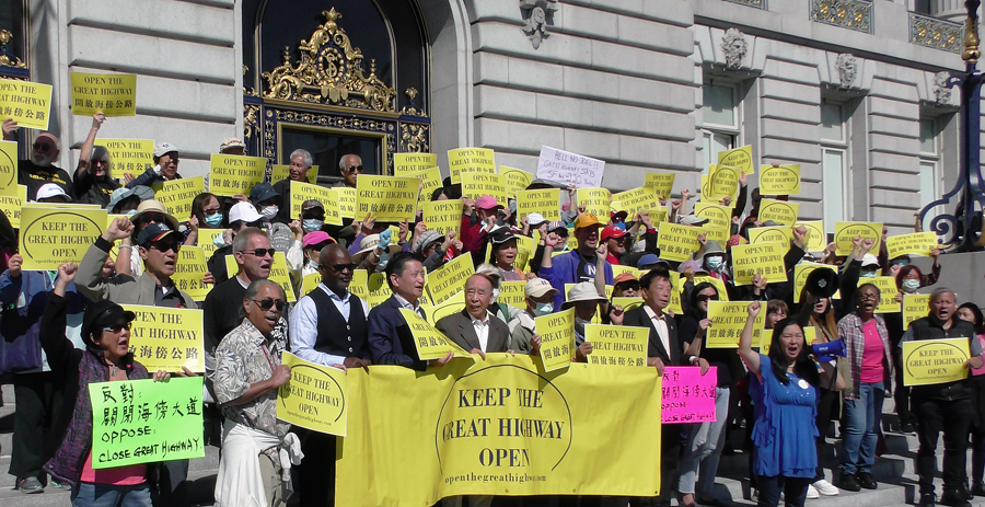 More than 100 people lined the steps in front of City Hall on July 23 to protest against permanently closing the Upper Great Highway for motor vehicle traffic between Lincoln Way and Sloat Boulevard.