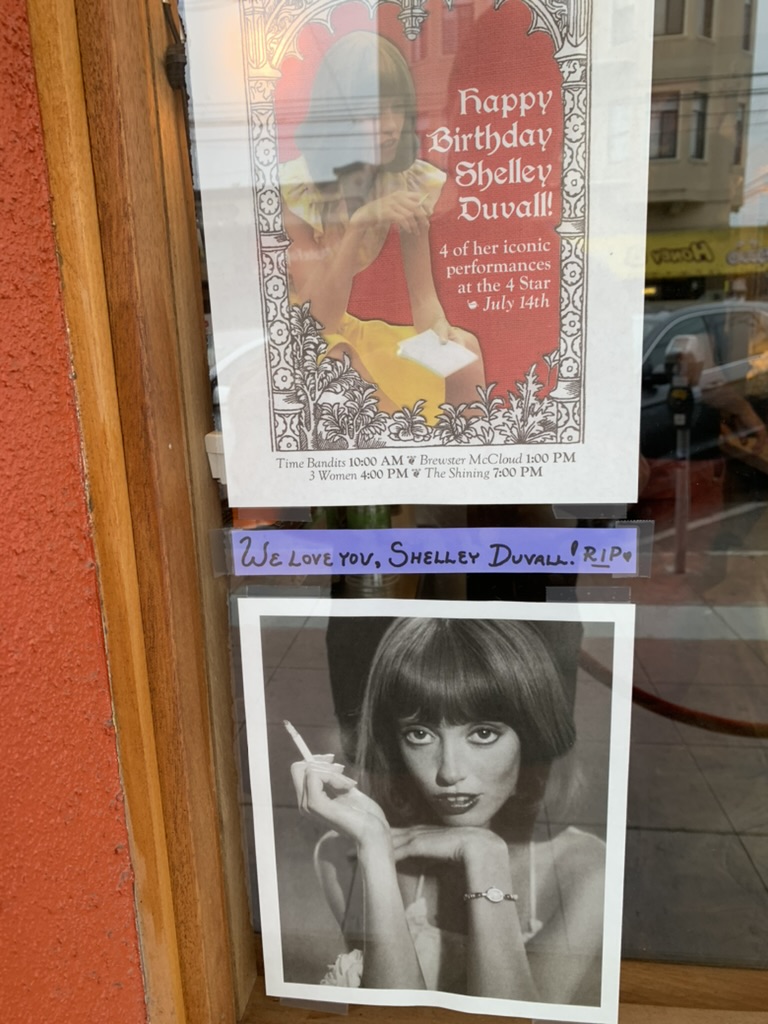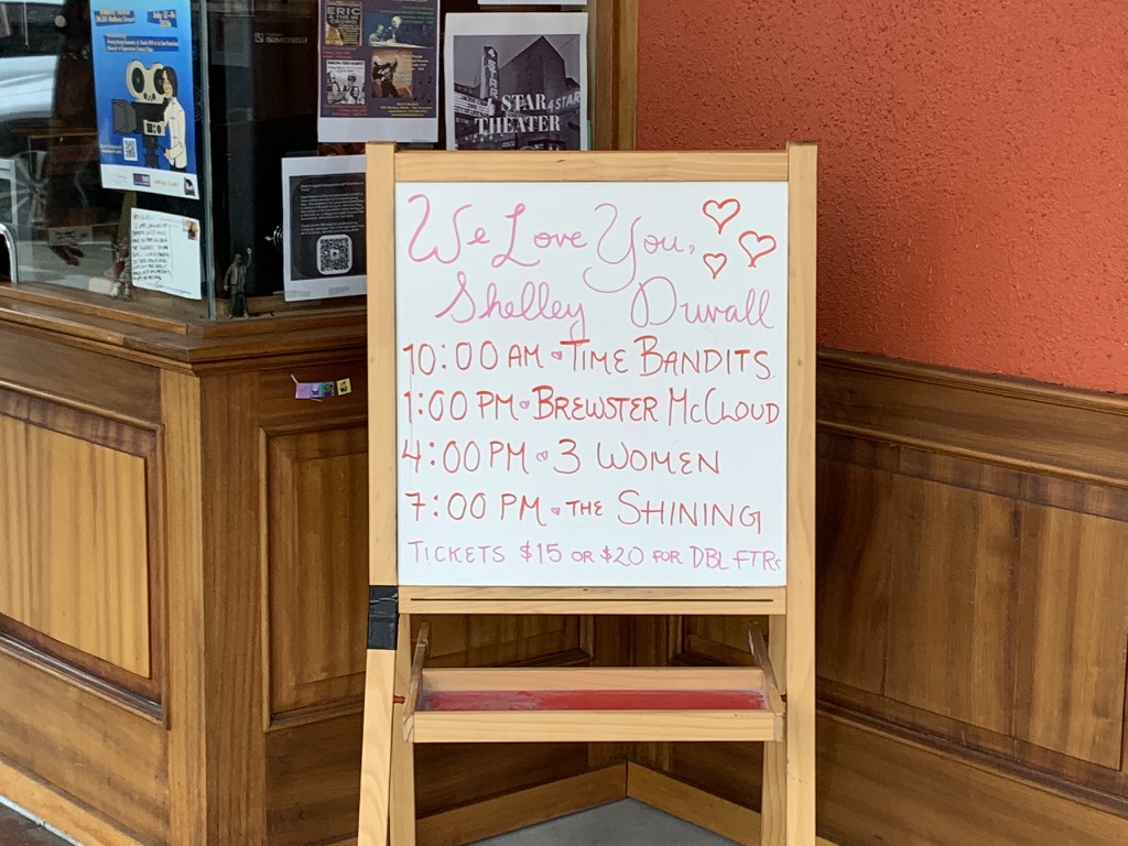Upon stepping inside the cinema, this immortalization was palpable. Patrons were greeted by Duvall’s name on the marquee, her photos posted around the box office and “We love you Shelley Duvall” written seemingly everywhere. Movie-goers flocked to the theater to show their support, flowing out onto the street and into Tunnel Record’s shop adjoining the theater.