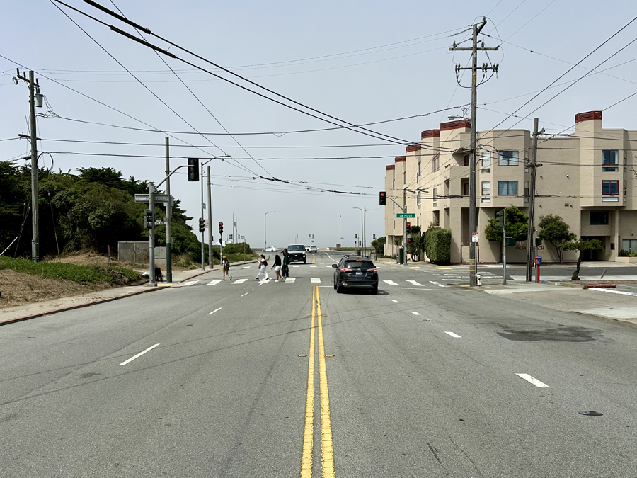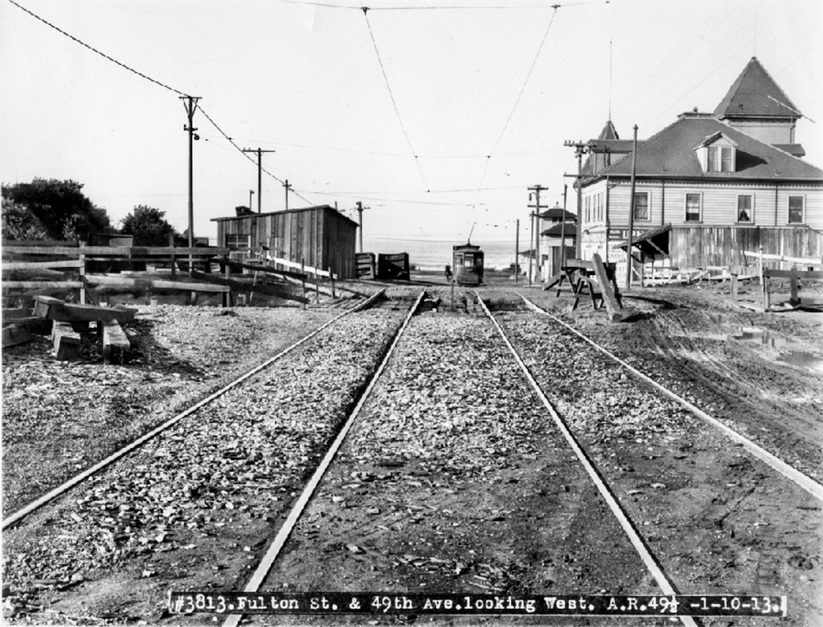 Above: This view is looking west on Fulton Street toward Ocean Beach at La Playa Street (once called 49th Avenue) on Jan. 10, 1913. Many of the old “Then and Now” photos show the west side crisscrossed with streetcar lines. All the working rail lines are gone from the Richmond District. Photo courtesy of a private collector/Western Neighborhoods Project/OpenSFHistory. Below: Electric power lines above the road now power the 5-Fulton bus with a terminus at La Playa and Cabrillo streets. To the right of the photograph is the Safeway supermarket. Photo by Michael Durand.