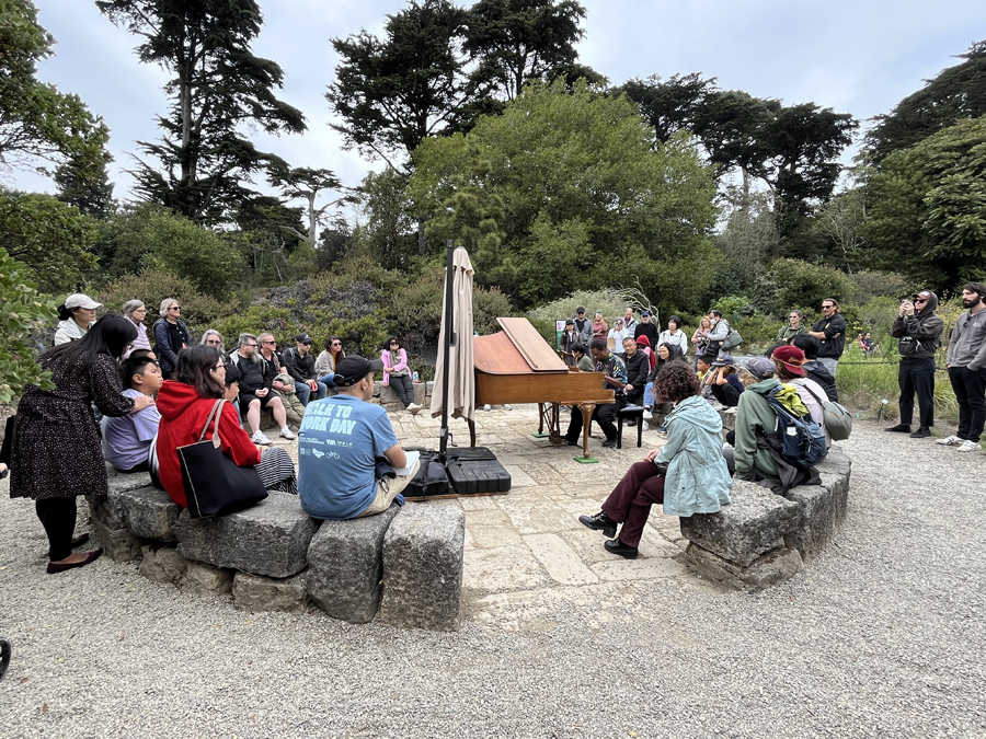 Pianists come from far and wide to participate in Flower Piano, including Kris Nicholson, who traveled all the way from Florida. Nicholson began playing the piano at three years old and can play by ear. As he transitioned from “What a Wonderful World” by Bob Thiele and George David Weiss into “Smile” by Charlie Chaplin in a unique mashup, Nicholson illuminated the faces of his audience seated on stone benches in a clearing in the California Native Garden, offering him and his piano an intimate embrace.