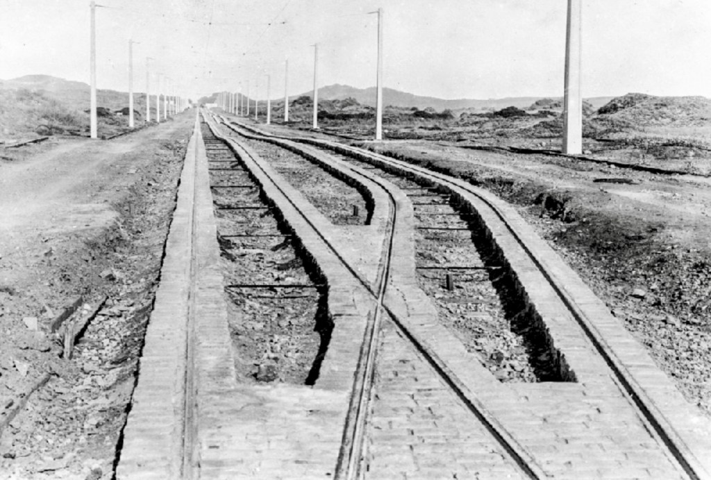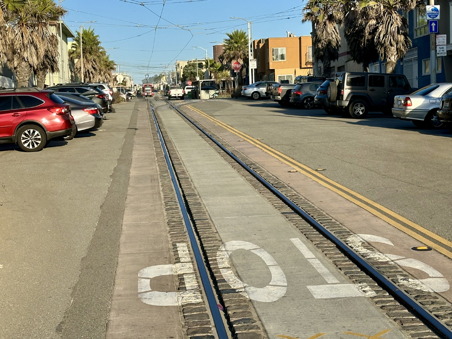 Above: Taraval Street and Great Highway, Sept. 8, 1922. View east on Taraval from Great Highway showing old terminal of L-line street car tracks. These original tracks between 46th Avenue and Great Highway survived until being replaced in 2021. The Belgian blocks lining the rails were preserved and wwreused to line the new tracks. Photo and caption courtesy of a private collector/Western Neighborhoods Project/OpenSFHistory. Below: The old blocks are clearly visible (and felt when driving over them) at the western end of Taraval. Photo by Michael Durand.