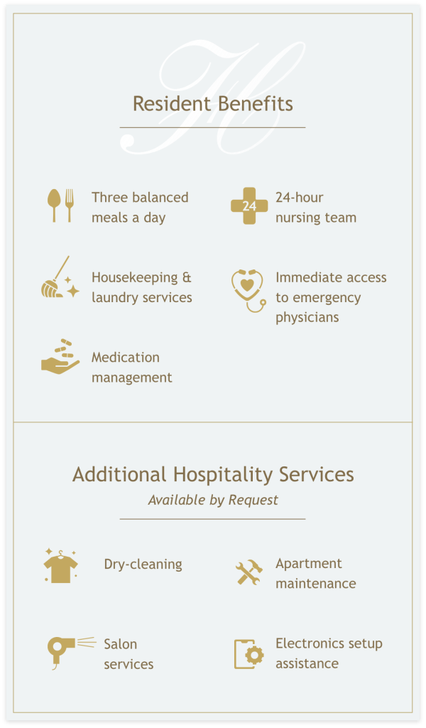 As a distinguished Independent and Assisted Living community, Heritage on the Marina offers a residential haven for individuals who wish to maintain an active lifestyle, but no longer want to maintain a home. Our residents benefit from three balanced meals daily, housekeeping and laundry services, medication management, a responsive 24-hour nursing team, and immediate access to emergency physicians. Additional hospitality services such as dry-cleaning, apartment maintenance, salon services, and electronics setup assistance are available by request.