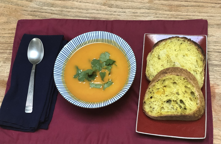 The fall season brings us many naturally colorful fruits and vegetables that are needed for the shorter and darker days. Beta carotene, an antioxidant present in pumpkin, carrots and sweet potatoes used in this recipe, is beneficial for our vision and the immune system which can be compromised in the winter. In addition, these vegetables also contain other health-promoting nutrients such as good amounts of potassium, bioflavonoids and carotenoids.