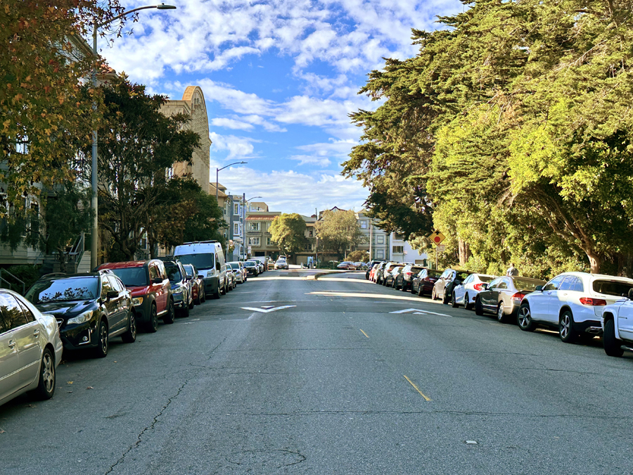 Below: As with most “now” photos in this feature, streetcar tracks are gone and plenty of trees fill the scene. Also gone (or paved over) are the cobblestones. A sign of modern times is the presence of speed humps. Photo by Michael Durand.