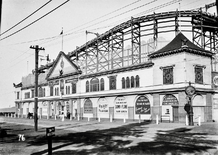 Above: The Chutes, on Fulton Street between 10th and 11th avenues. According to Greg Gaar at FoundSF.org, the Richmond District in 1902-1907 was home to the Chutes, the “largest pleasure resort in America.” First introduced in London as a big toy for the wealthy and called the “Toboggan Slide,” Chutes franchises appeared all over Europe in the late 19th century. The thrill of riding a boat down giant water slide and careening into a lake at “a mile a minute” quickly became a big splash in America. Coney Island was the site of the country’s premier Chutes. On Nov. 2, 1895, San Francisco’s first Chutes opened on Haight Street at Cole Street. Finding the grounds too small to accommodate the large crowds, “new Chutes” opened on Fulton at 10th Avenue in 1902. The admission charge was a dime for adults and a nickel for children. It later moved to Fillmore Street bounded by Webster, Eddy and Turk streets. Photo courtesy of a private collector/Western Neighborhoods Project/OpenSFHistory. Below: Today, houses and apartments fill the block that was once an amusement park. Photo by Michael Durand.