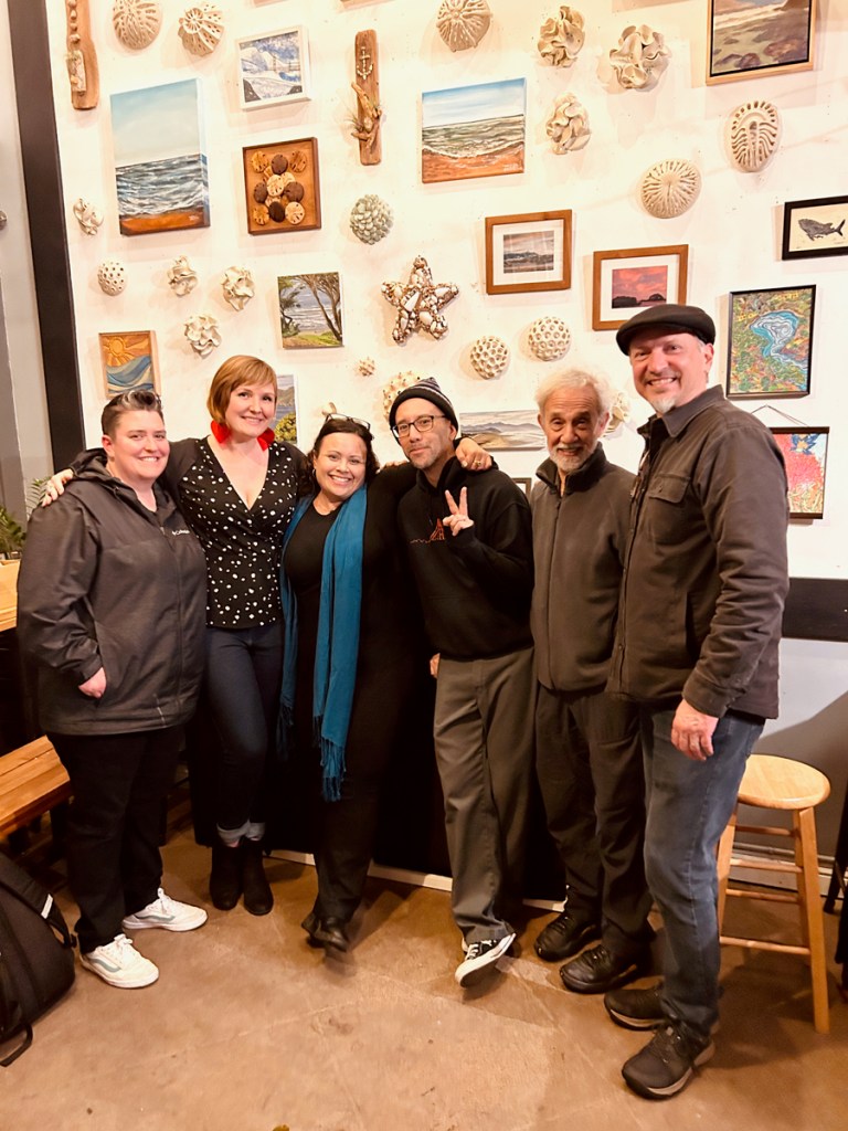 Local artists (L-R) Micky Healy, Laine Wiesemann, DeeDee Hunt, Nate Tan, Andy Forrest and Roy Tahtinen kick off another season at Hunt & Gather Gallery at 1108 Irving St. in the Inner Sunset. Hunt and Gather Gallery was packed with visitors the evening of Dec. 7 for the Inner Sunset Holiday Lights Stroll and is a popular stop during Inner Sunset Art Walk events held throughout the year. Learn more at innersunsetmerchants.org and huntandgathersf.com. Courtesy photo.