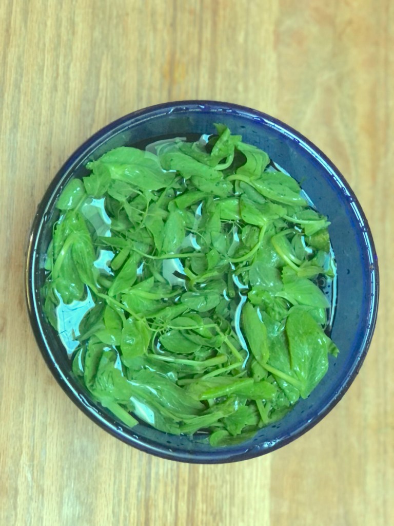 Many people make a new year’s resolution that involves cooking and eating more healthy food. This is a great idea and worth practicing year around. One of my resolutions is to include more varieties of leafy greens in my diet. This Sunday, I purchased pea shoots from the farmers’ market, which I have not used in a long time.
