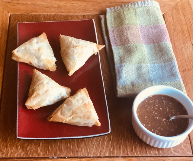 This is my adaptation of an Indian savory dish called a Samosa using Greek filo (also spelled phyllo) pastry. Samosas are popular appetizers in India, sold all over the country. They are made of wheat dough, which is rolled and filled with cooked potatoes, peas and other vegetables (or meat). They are folded into small triangles and then deep-fried. Since I avoid deep-fried foods because they are not healthy, I made a recipe in which filo pastry is used to wrap the cooked vegetables before folding them into triangles. Then, I bake the samosas instead of deep frying them. I hope you enjoy them as much as I do.