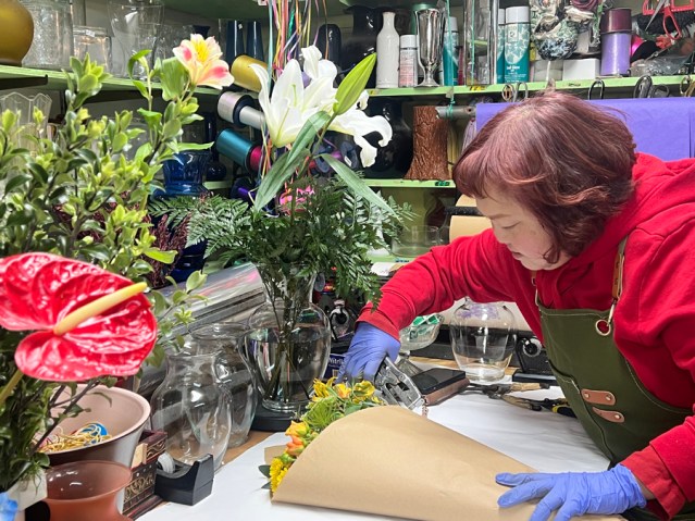 Hee Seung Lee can often be spotted carefully arranging flowers. Known to many customers by her English name Victor, she wears a green canvas florist apron that remains spotless, but her blue gloves bear the marks of a busy morning.