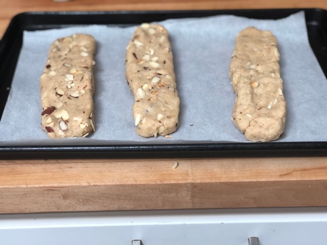 Place parchment paper on two baking trays (cookie sheets). Take out the logs from the refrigerator and place them on a cutting board. Flatten each log into a rectangular shape that is about 4” x 7” x 1” (tall) and place them on the trays. Place them in the preheated oven and bake for 20 to 25 minutes until the edges have turned dry and light golden in color. Don’t over bake the logs as they will be sliced and baked a second time.