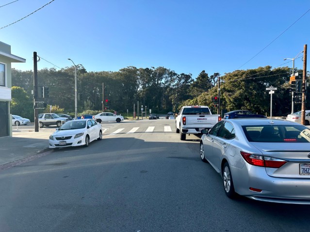 Below: This May 31 photo shows at least a dozen cars in what is now a very busy intersection. Today, 41st Avenue connects with Chain of Lakes Drive into Golden Gate Park which is one of only two direct connectors through the park between the Sunset and Richmond districts. Traffic lights replaced stop signs earlier this year. Photo by Michael Durand.