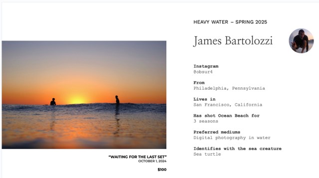 “Heavy Water: Two Seasons at Ocean Beach” debuted with 22 photographers showcasing their work exclusively from the 2023-2025 fall and winter seasons at Ocean Beach. Mollusk’s art room displayed one print per contributor and a more extensive slideshow with storytelling and presentations from each contributor.