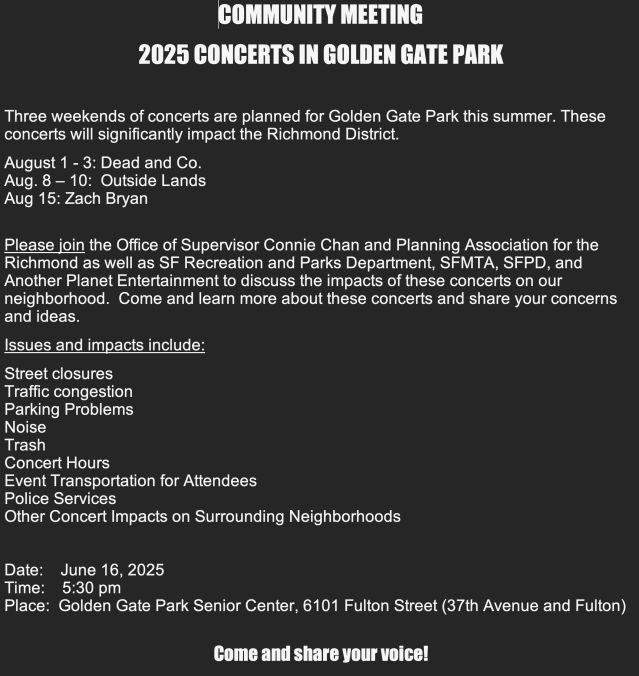 1. Add 2 weeks of setup and 2 weeks to break down and we have 7 weeks without access to most of Golden gate Park because they block roads and fence off hundreds of acres .
