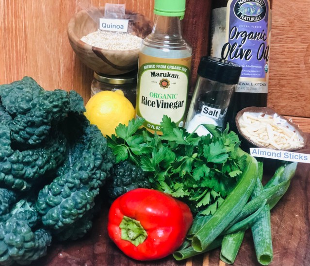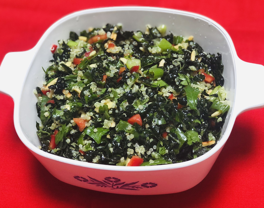 Lastly, assemble everything. Add the companion vegetables and herbs to the massaged kale and mix them gently. Then measure out one cup of cooked quinoa and add to the kale mixture. With a wood spoon, gently mix all of the ingredients while pouring the dressing – enough to moisten the salad thoroughly but without drenching. Set aside rest of the dressing.