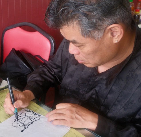Chen carries a brush and ink with him wherever he goes. For several years now, it has been his mission to create art using paper – mostly napkins – to leave in cafes or restaurants for others to appreciate and eventually throw away. According to Le, Chen finishes a drawing in the time it takes for him to be served. From time to time, Chen will also create sculptures out of napkins, such as a doll in full geisha dress, and leave them as “toys” for children to play with or decorate.