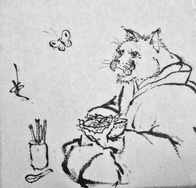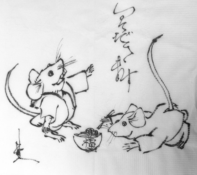 Mien Le, a waitress, first noticed the napkin drawings and was impressed. She found them to be so good that she put them under the tables’ glass tops to preserve and share with everyone who came in. The subjects of the drawings are whimsical: mice dressed in kimonos and eating noodles with chopsticks; a kimono-clad cat spying a butterfly; the emperor and empress of Japan in ceremonial dress; an old man with flowing hair and staff walking against the wind and many others. The artwork is reminiscent of paintings on Japanese scrolls and of characters in Japanese folklore. Who is this pho phantom, napkin artist?
