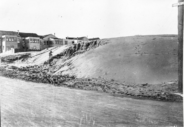 Above: This northwest view of Anza Street looking toward 19th Avenue on Dec. 22, 1914, shows a huge sand dune – undoubtedly a great source of entertainment for local kids. The backs of houses on 19th Avenue are visible at left. Photo courtesy of a private collector/Western Neighborhoods Project/OpenSFHistory.