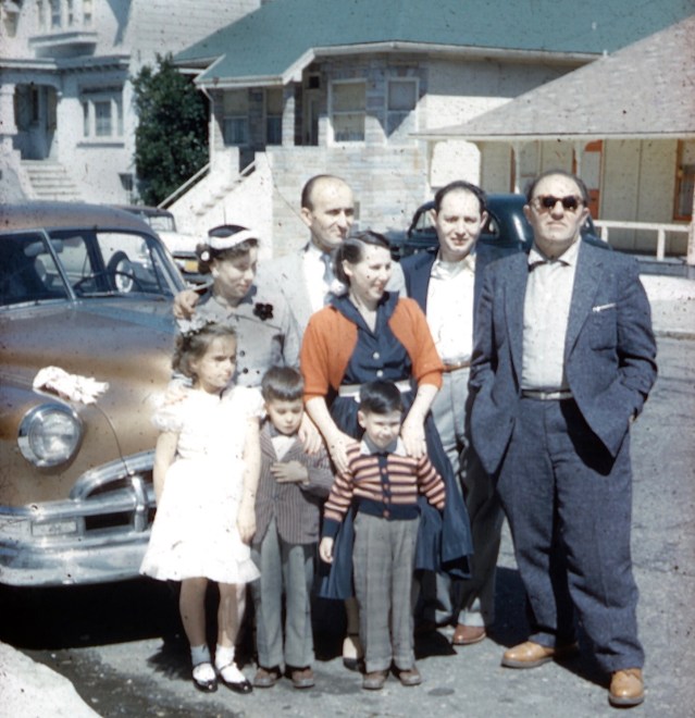 The Glass family is pictured here in 1956 alongside Nathan Green (wearing sunglasses) at Lincoln Way and 21st Avenue. Green, a Holocaust survivor, was the owner of the building which housed the Nazi bookstore. He was unaware of the nature of the business when he leased the space. Dave Glass is pictured in the front row wearing a jacket. Photo courtesy of Dave Glass.
