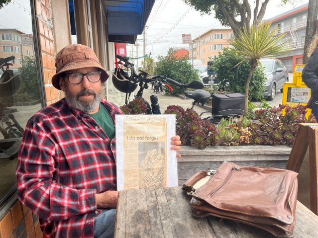 San Francisco native Dave Glass shows one of the many newspaper clips he saved about how irate Outer Sunset District neighbors forcefully evicted a Nazi bookstore on Taraval Street in 1977. Many of the neighbors were Holocaust survivors who abhorred the presence of the controversial business. Photo by Nicholas David.