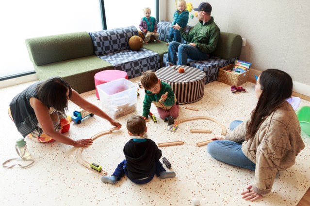 Within the interior of the space, the central playroom is commonly known as the living room. Filled with comfortable places to sit, parents and kids can play with toys and, McAnulty said, find peace in the fact that there’s nothing their kids can break or hurt, making it a place where parents can “take their shoes off and take a breath.”