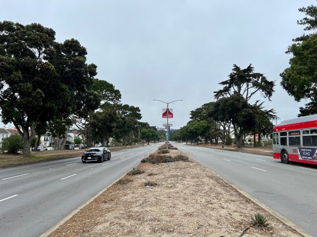 Below: The lush blanket of grass in the “then” photo is now mostly dirt with some succulents. The trees along the roadway lend a park-like look to the boulevard. Photo by Jillian Regan.