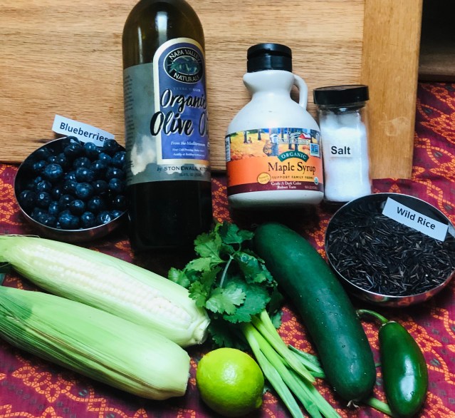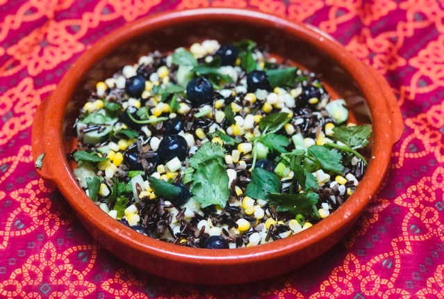 Although many difficult and time-consuming techniques were used by Native Americans to procure and process their food, their cuisine was simple. So, the traditional recipes for wild rice salad simply used wild rice and blueberries with some dressing. Addition of other food items, such as corn, are now popular among the fusion cuisine enthusiasts and modern chefs. I personally like the corn in this recipe because the sweet flavor and soft texture of corn go well with the fibrous and nutty wild rice. The white or yellow dots of corn also add the color to the “sticky” wild rice.