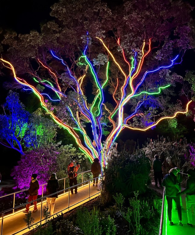 Lightscape at the Botanical Garden highlights some of its most prized features and plants. According to Brendan Lange, director of advancement for the Gardens of Golden Gate Park, an art installation titled the “Neon Strawberry Tree” is “expected to be one of the most iconic installations in the show.” The installation crew, with the help of a large crane, wrapped ropes of colored neon lights around the towering Canary Island Strawberry Tree (Arbutus Canariensis) located in the South Africa Garden. Given the size of the tree, its dramatic lighting can be seen from numerous vantage points in the Garden. This legacy tree is rumored to have been planted around 1890. Listed as vulnerable to extinction in 1998, the species is now stable, thanks to the work of botanical gardens, including San Francisco’s.