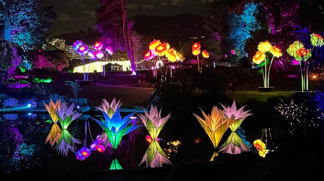 In the Garden’s famed Redwood Grove, a light show is projected from the base of the towering trees, some of which are more than 100 years old. The main Waterfowl Pond is filled with lighted sculptures of giant lilies and towering bouquets of glowing peonies can be seen from its banks. Lightscape projects music as well as light throughout the Garden.