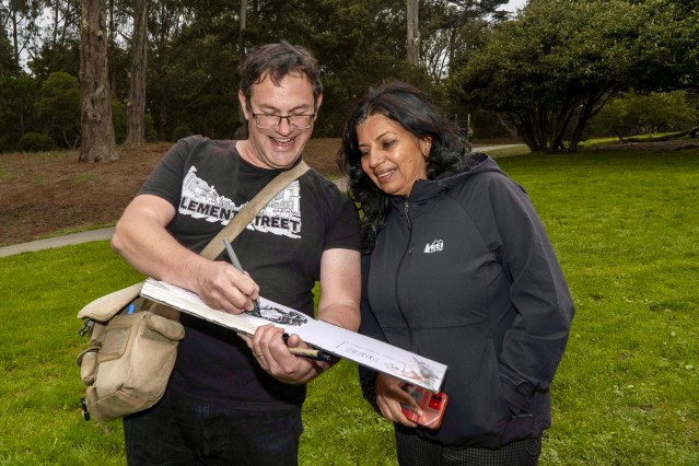 The England-born illustrator has spent the past 15 years documenting San Francisco through his sketchbooks, creating visual records of everything from protest marches and Shakespeare in the Park performances to mushrooms and construction equipment. His hobby combines keen observation with a narrative flair, often weaving scientific information and snippets of dialogue into his drawings. What began as a personal pursuit after graduating from the Academy of Art University has evolved into a community-building force within the City’s sketching circles.