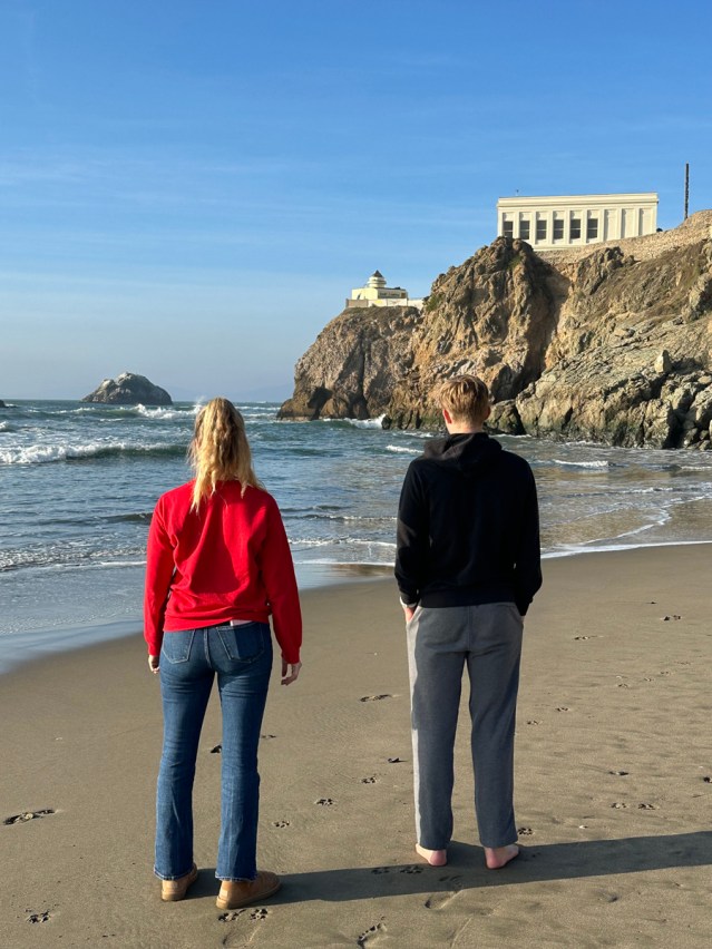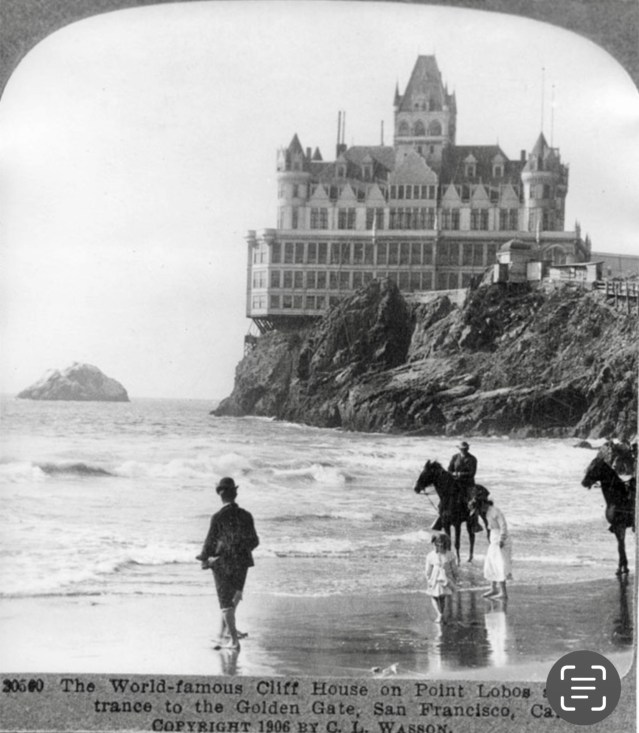 Below: This photo of the currently vacant Cliff House was taken on Nov. 29, 2025. Neither horses nor gentlemen wearing top hats were on the beach that day, but Bethany and Luke Armstrong agreed to be in the “now” picture. They came to San Francisco from near Davis, Calif., to escape the tule fog in the Central Valley. Photo by Michael Durand.