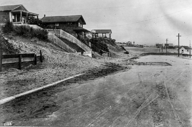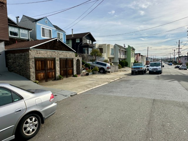 Above: This was the view looking south on 45th Avenue between Kirkham and Lawton streets on Jan. 5, 1915. Houses at 1562 and 1570 45th Ave., both built in 1905, can be seen at left, just a couple of the few homes constructed among the sand dunes that covered the Sunset District 110 years ago. Photo courtesy of a private collector/Western Neighborhoods Project/OpenSFHistory. Below: This photo from the same angle was taken on Dec. 3. At one point, after 1915, a stone garage with wooden doors was built for the house at 1562 45th Ave. Plus, there are a lot more wires overhead in the “now” picture. Photo by Michael Durand.