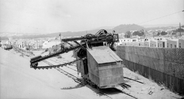 Above: The photo showing the view looking north/northeast on 21st Avenue near Pacheco Street was taken around 1935. It shows a sand conveyor streetcar used to clear a sand lot, the future home of a row of Sunset District residences. Visible in the distance in Golden Gate Park is Strawberry Hill located in the midlle of what was called Stow Lake (later renamed Blue Heron Lake). Photo courtesy of a private collector/Western Neighborhoods Project/OpenSFHistory.