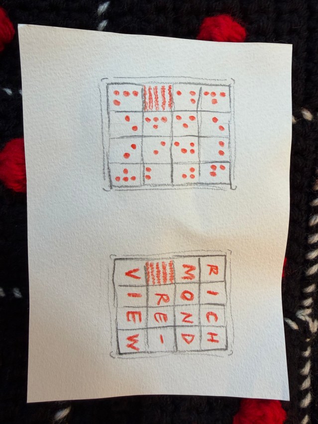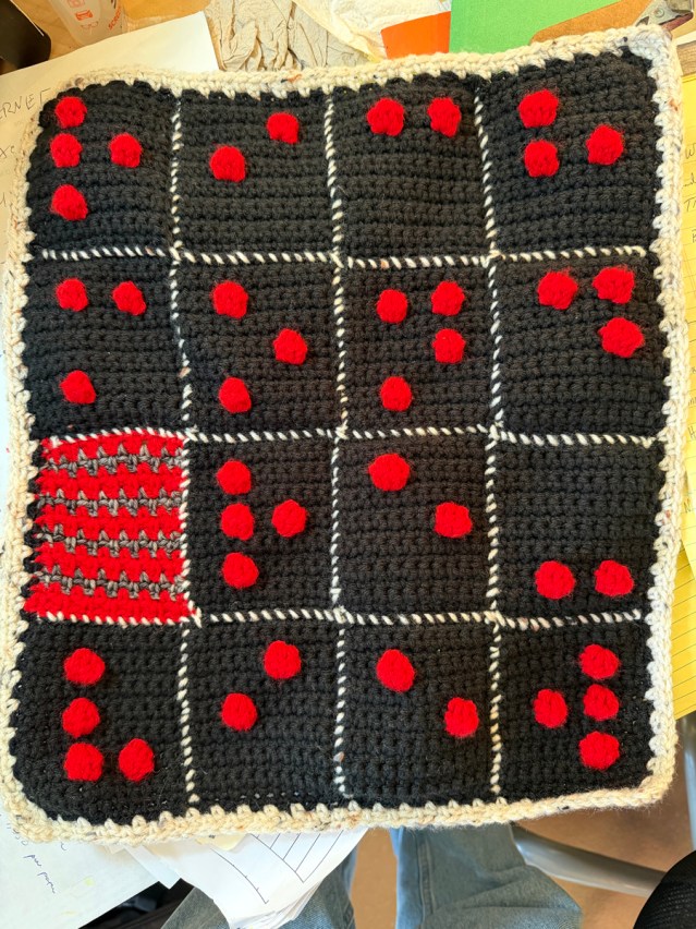 Kelly Low of SF Richmond Yarn Buddies (follow them on Facebook!) has been tremendously generous with her prodigious talent and has donated quite a few beautiful creations to the paper. Below is one of the quilts she made for us. This one reads, “Richmond Review” in BRAILLE in our colors, red and black.