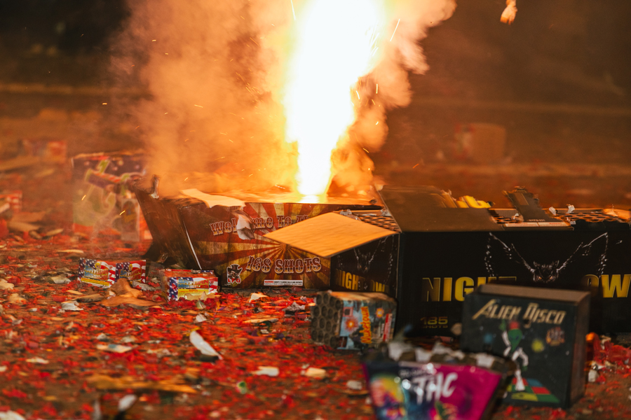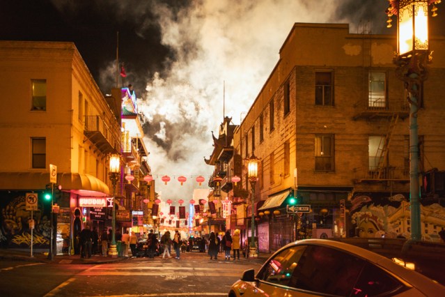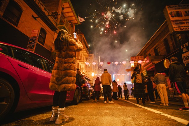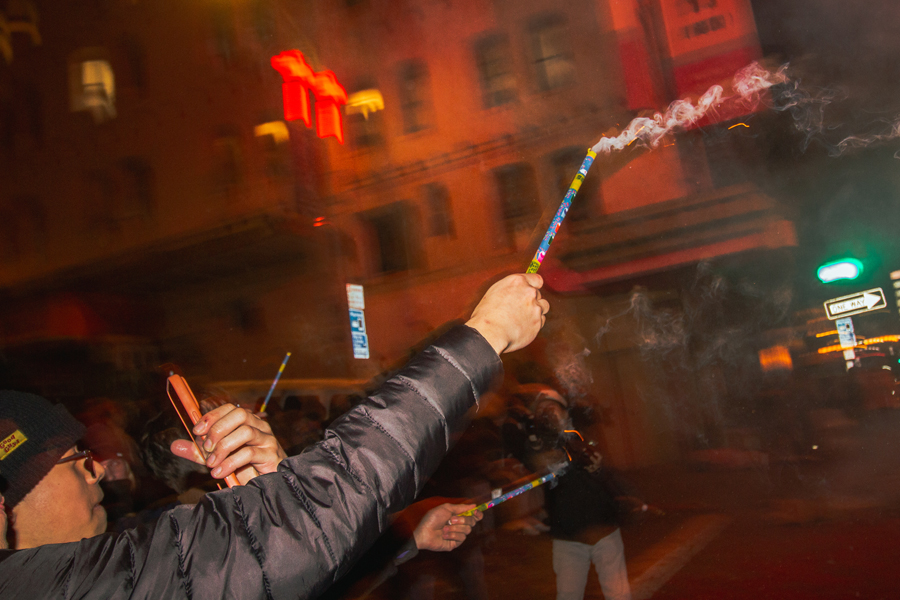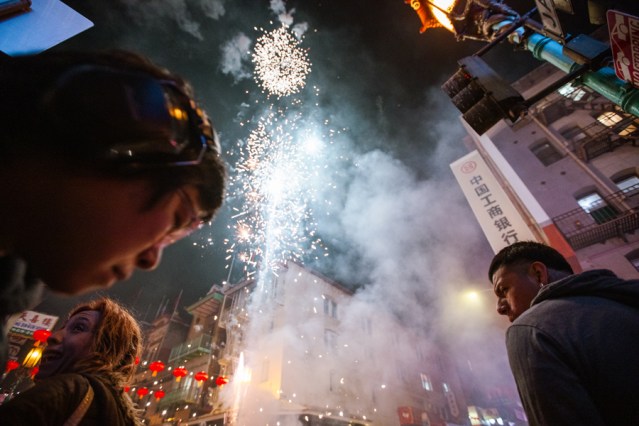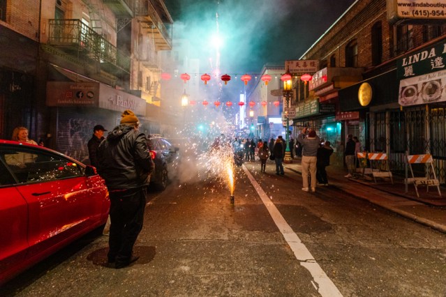 Fireworks explosion illuminates the intersection of Grant Avenue and Jackson Street. Fireworks are a hallmark of Lunar New Year festivities in Chinatown, where bursts of light and sound mark the holiday with traditions rooted in luck, protection and renewal.