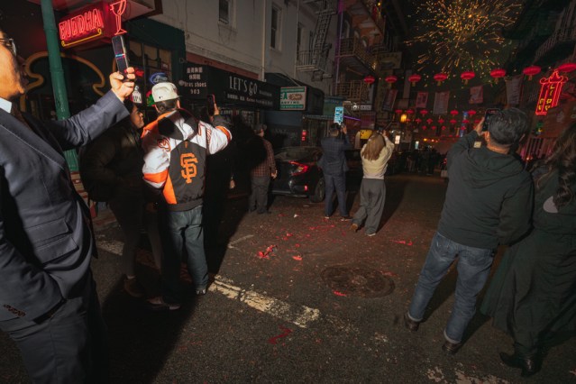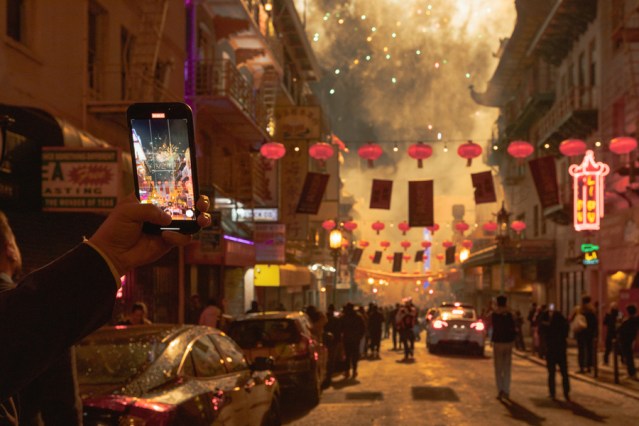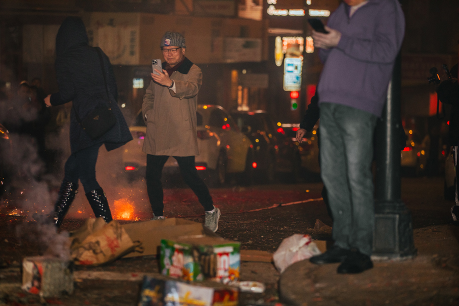 A man records the revelry in San Francisco Chinatown. Despite restrictions, fireworks remain a common sight during Lunar New Year celebrations in Chinatown.